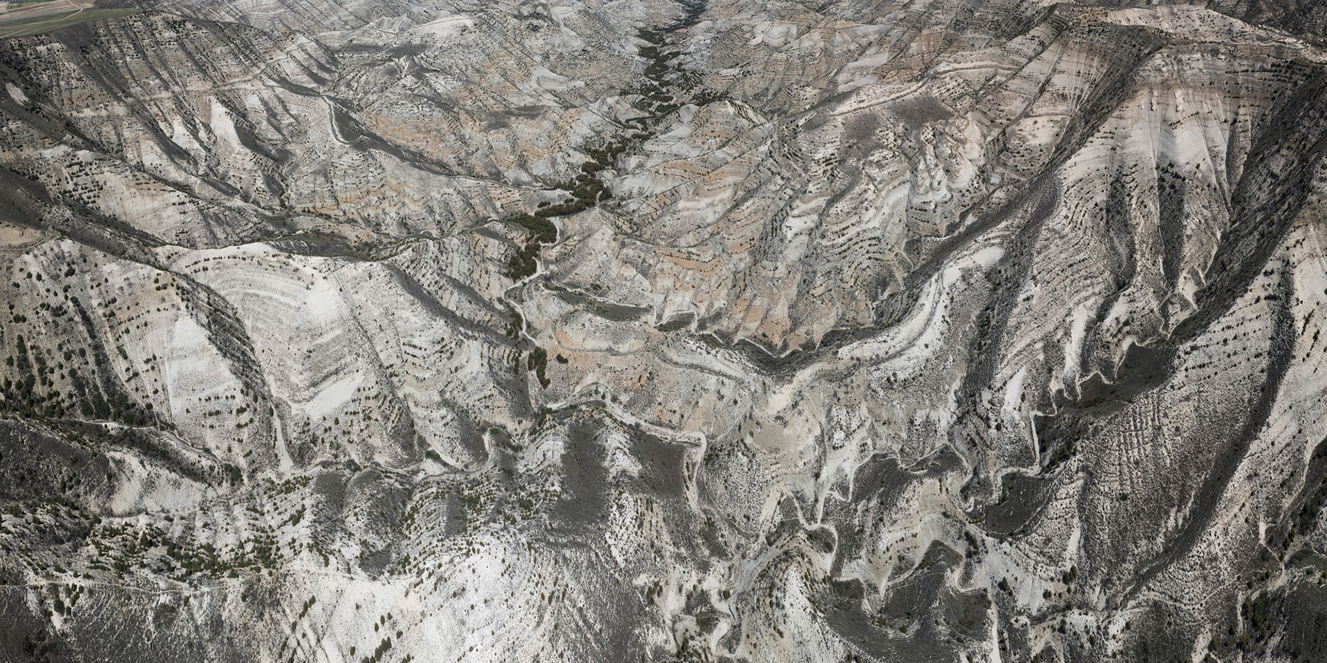 Edward Burtynsky: So, through the idea of approaching the project Erosion in Türkiye, I came to learn that Türkiye was one of the countries that had been doing a lot to overcome desertification and the effects of erosion. This is a large-scale terraforming project to reverse the effects of deforestation. Some of the images in the exhibition really point out the scale of this kind of terraforming, which is quite breathtaking. If you spend time with the mural in the exhibition, you can see that the terraforming happened probably 20-30 years ago. The grooves have disappeared, but you can see the lines of the trees are still starting to pop through. You can see that it has worked. It's still clinging on, but it's there and once the trees get big enough, they can then support life around them. Plant life can start to take off again, and then once you have your plant life then you have your animal life, you have your birds, you have your small animals, and they move things around and reseed things as well. So, this is really a kind of positive human activity to undo something that had a negative long-term effect by deforestation and probably over-farming combination causing the lands to dry out. It's an attempt to prevent that continued disintegration of that landscape.